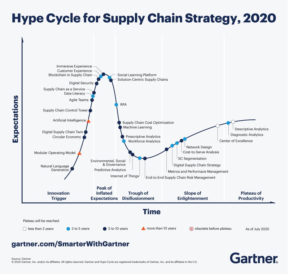 Here are five capabilities from the Gartner Hype Cycle for Supply Chain Strategy, 2020 that supply chain leaders should have on their radar.
