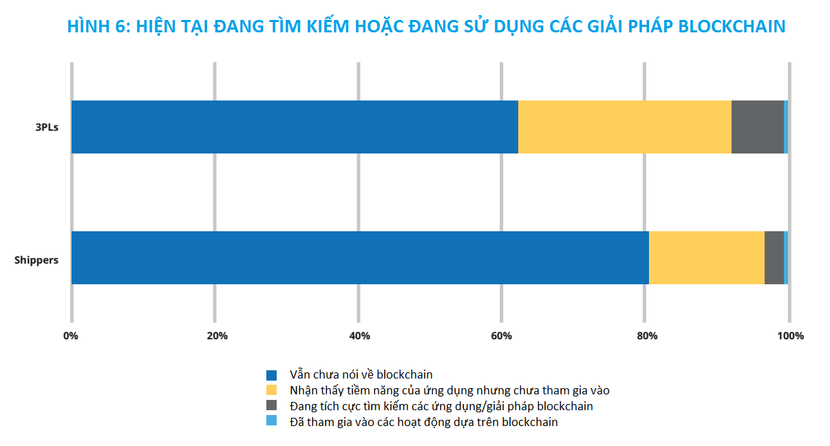 Do đang trong giai đoạn mới bắt đầu, hệ sinh thái blockchain cần sự phát triển thêm. Hầu hết các chủ hàng-81% – và 3PL – 62% – họ vẫn chưa thảo luận về blockchain, thể hiện trong hình 6