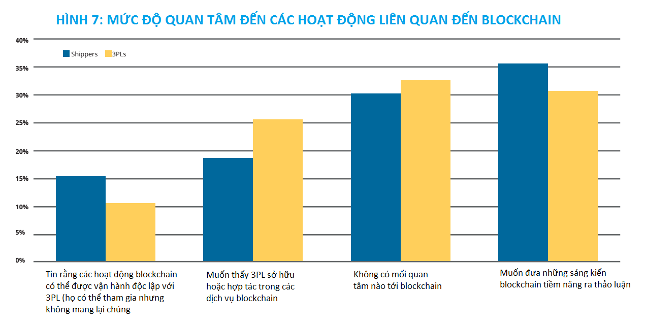 - Các chủ hàng và 3PL gần như đều quan tâm đến việc sử dụng blockchain để truy xuất nguồn gốc cũng như việc sử dụng blockchain để đáp ứng các yêu cầu quy định.