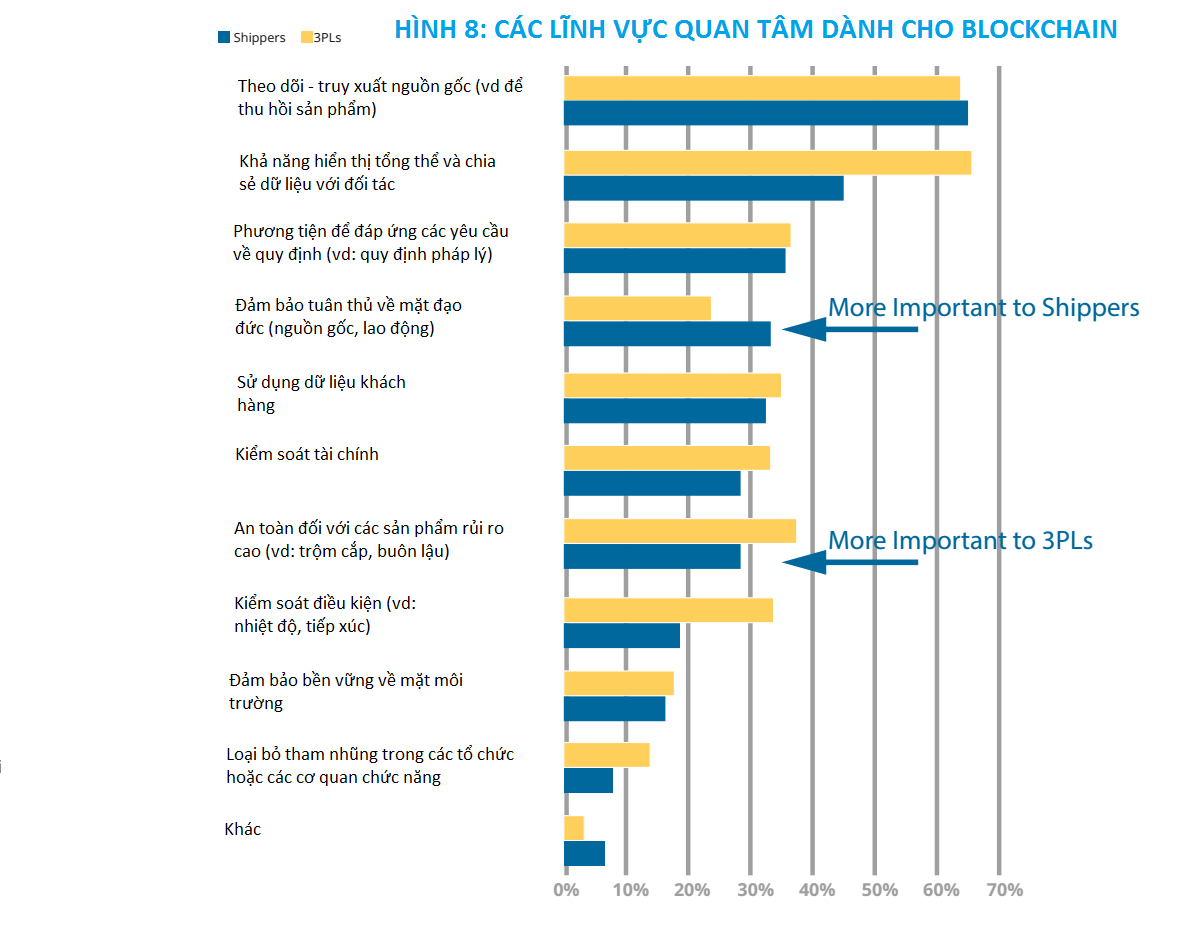 Blockchain cung cấp một trung tâm dữ liệu trên nhiều hệ thống, cho phép theo dõi thống nhất và đầy đủ vòng đời của sản phẩm. Các chủ hàng và 3PL gần như đều quan tâm đến việc sử dụng blockchain để truy xuất nguồn gốc – 64% 3PL và 65% các chủ hàng – cũng như việc sử dụng blockchain để đáp ứng các yêu cầu về quy định – 37% 3PL và 36% các chủ hàng, thể hiện trong hình 8.