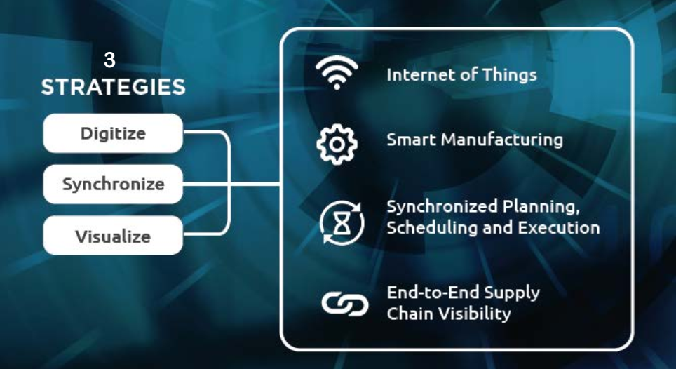 Họ đang thực hiện các chiến lược sản xuất theo nhu cầu (demand-driven manufacturing) hiện đại theo các bước sau đây: Số hóa, đồng bộ hóa và hiển thị (digitize, synchronize, visualize).