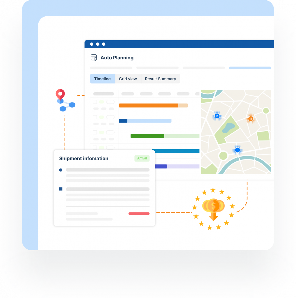 Nền tảng tự động tính toán và thiết lập kế hoạch phân chuyến hàng ngày, rút ngắn quãng đường và chi phí vận chuyển với tính năng điều phối tự động.