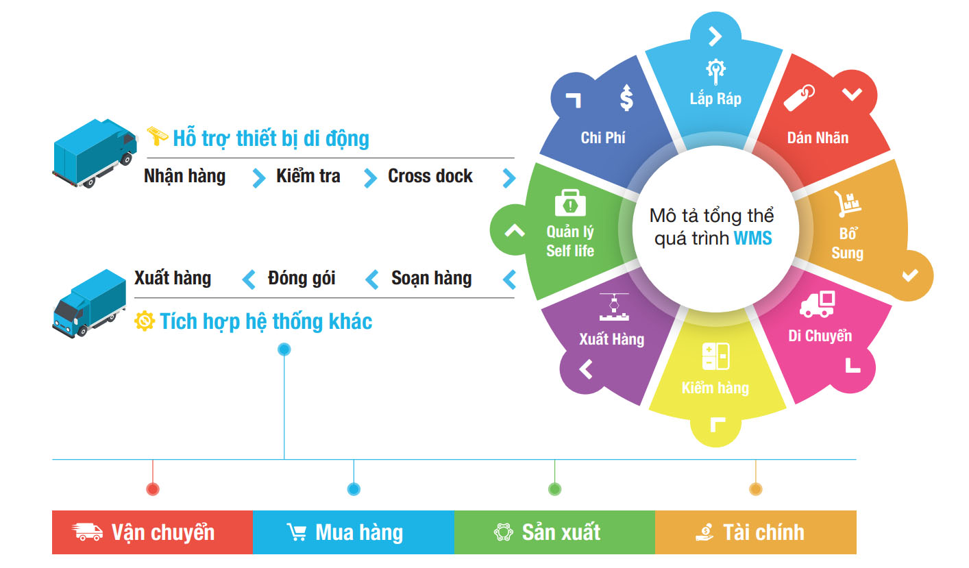 Mục tiêu giải pháp trong quản lý kho hàng FMCG: Tối ưu hóa vận hành kho hàng về quy trình, layout, MHE, nhân sự – chuẩn hoá master data – quản lý toàn bộ giao dịch trên hệ thống SWM.