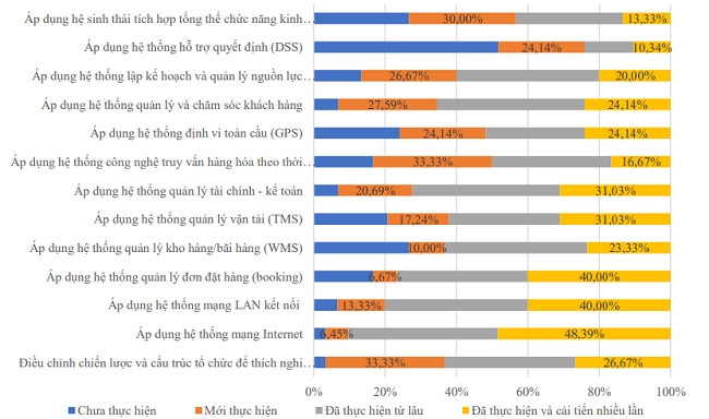 Khảo sát của nhóm tác giả báo cáo thường niên “Kinh tế Việt Nam 2022: Nâng cao nền tảng số cho ngành dịch vụ” cũng cho thấy, cộng đồng doanh nghiệp logistics tích cực triển khai các hoạt động chuyển đổi số, trong đó tập trung nhiều nhất là việc áp dụng hệ thống mạng internet; mạng LAN kết nối; hệ thống quản lý kho hàng hải cảng…