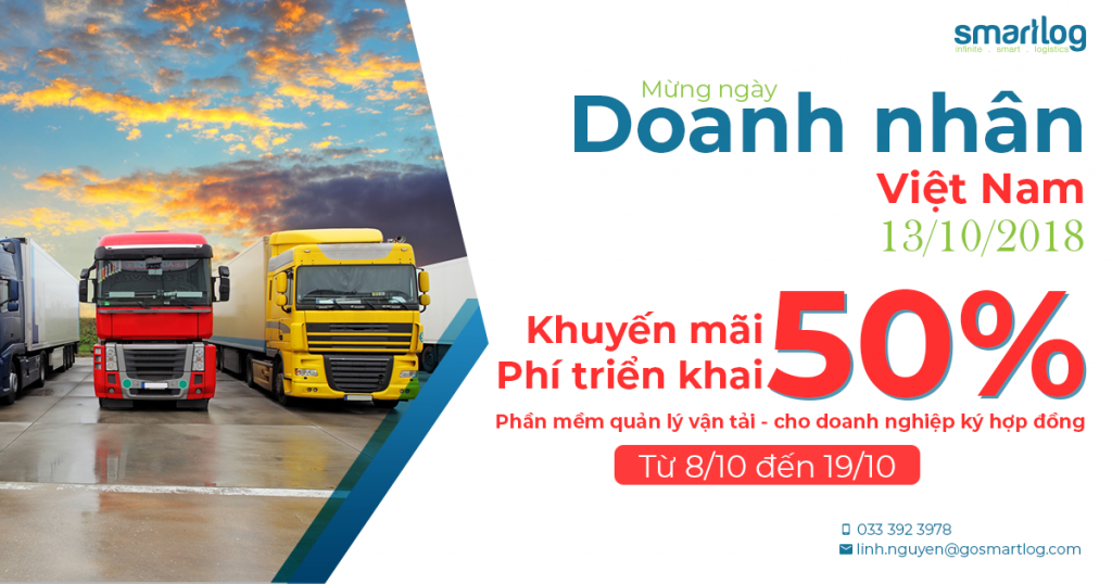 Nhằm tri ân Quý Khách hàng nhân ngày Doanh nhân Việt Nam, từ ngày 08/10 – 19/10/2018 Smartlog triển khai chương trình khuyến mãi “Giảm 50% phí triển khai giải pháp quản lý vận tải & nhà kho cho doanh nghiệp”.