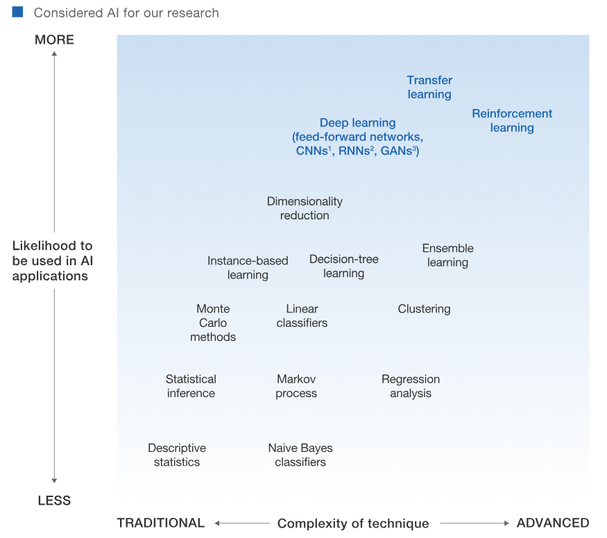 Chúng tôi đã thu thập và phân tích hơn 400 tình huống ứng của AI trong 19 lĩnh vực và 09 bộ phận kinh doanh. Các tình huống này cho thấy tiềm năng AI trong những quy phạm xác định, điều đáng trân trọng ở đây chính là việc chúng tôi cũng dành thời gian để so sánh AI với các công cụ phân tích truyền thống (hình 2), ở mức quy định về mặt dữ liệu – độ lớn, độ đa dạng, và độ linh hoạt – phù hợp để nhận định tiềm năng. Các tình huống khai thác AI của chúng tôi tuy đa dạng nhưng vẫn chưa phải là toàn diện, và do đó đôi khi, chúng tôi có thể đánh giá quá cao hay quá thấp tiềm năng của AI trong một số ngành. Chúng tôi không ngừng thu thập, chọn lựa và thêm vào “thư viện nghiên cứu ứng dụng AI” của mình để nâng cao tính khách quan khi đánh giá.