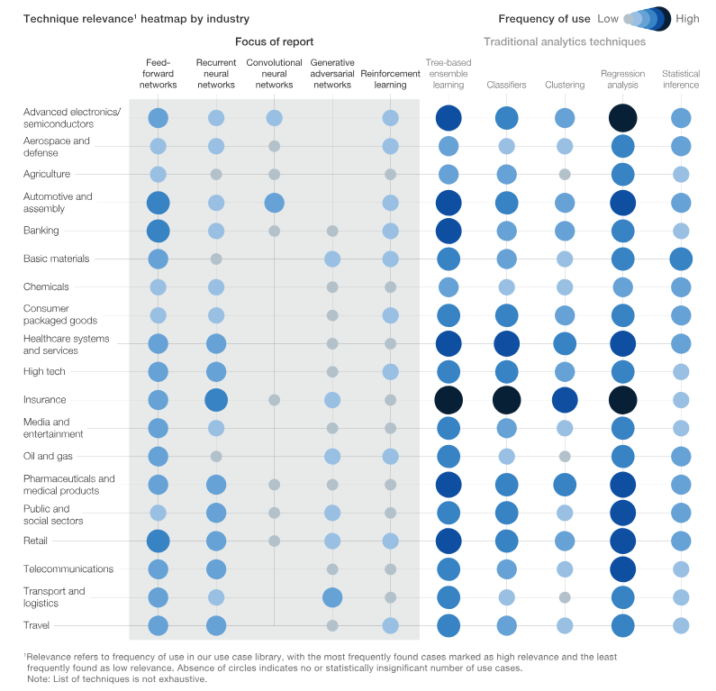 69% các tình huống mà chúng tôi nghiên cứu, mạng lưới nơ rôn sâu được sử dụng nhằm nâng cao hiệu quả của các công cụ phân tích cũ. Những tình huống đầu tư mới cho AI hiện chỉ chiếm 16% tổng số tình huống. Và ở 15% số tình huống còn lại, AI vẫn chưa chứng minh được sự ưu việt của nó so với các công cụ phân tích hiện nay, sự hạn chế của dữ liệu là một trong số những nguyên nhân giải thích cho điều này.