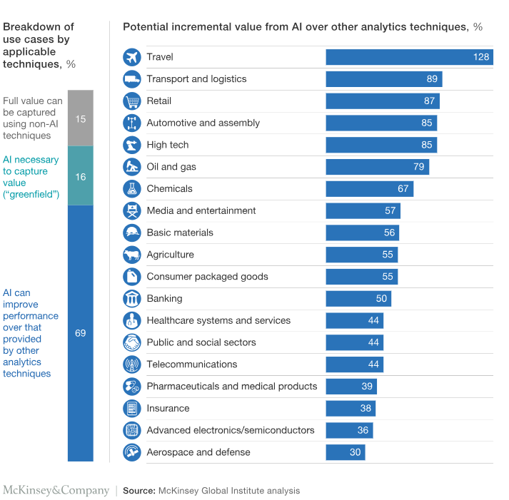 Các tình huống của chúng tôi chỉ ra AI có tiềm năng lớn để mang lại nhiều giá trị cho doanh nghiệp hơn so với các công phụ phân tích truyền thông từ 30 đến 128%, tùy ngành.
