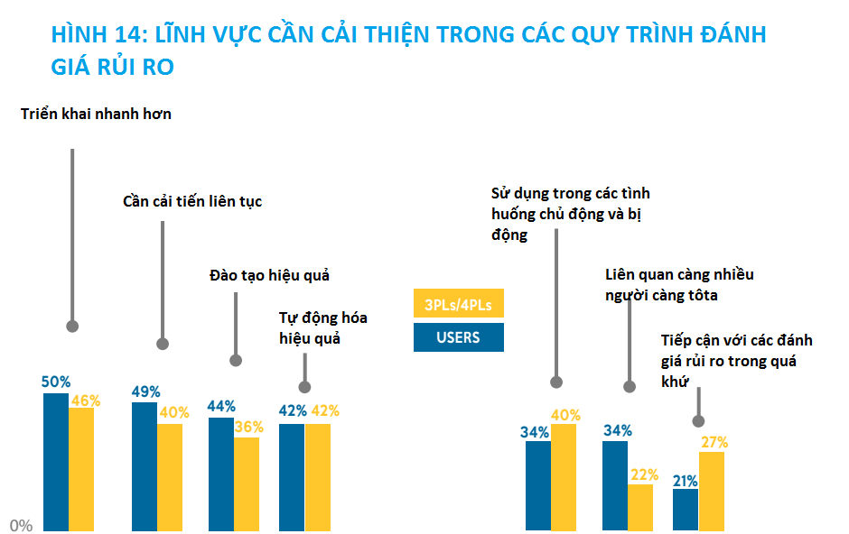 Hình 14 biểu thị phản ứng của chủ hàng và 3PL khi được hỏi về những lĩnh vực mà 3PL cần phải cải tiến trong quá trình đánh giá rủi ro.
