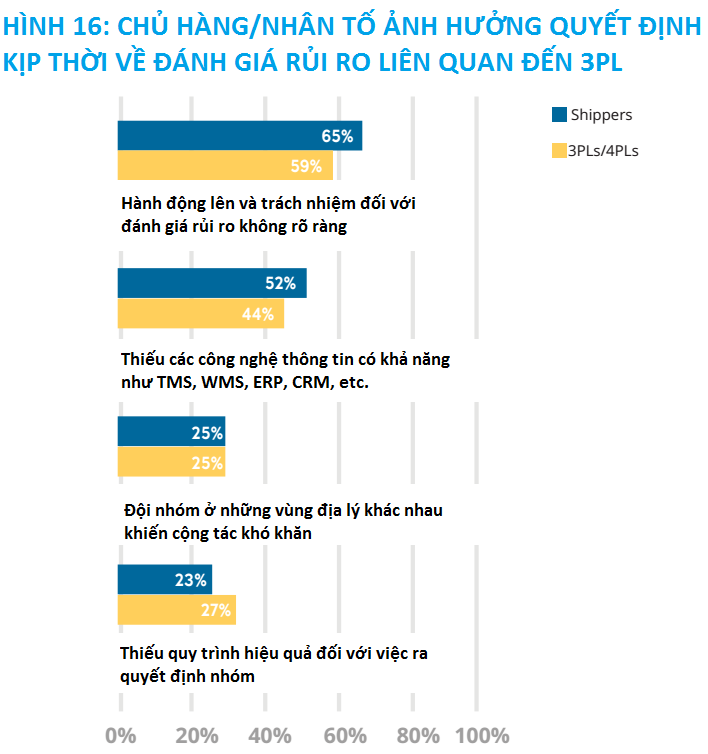 Một quan điểm thú vị được cung cấp trong Hình 16 xác định các nguyên nhân chính có thể gây cản trở các nhà cung cấp 3PL trong việc đưa ra các quyết định cần thiết một cách kịp thời.