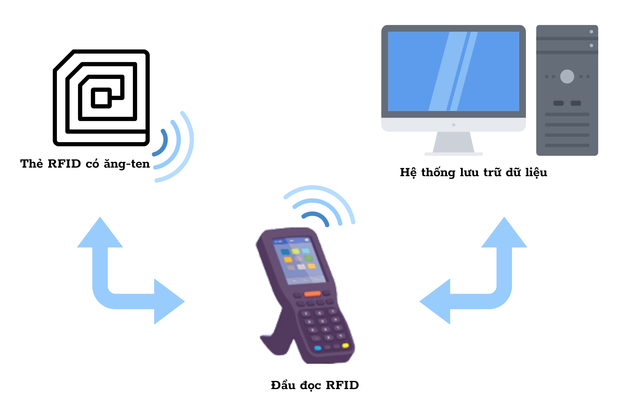 Thẻ RFID có gắn chip và ăng-ten có tác dụng thu và phát sóng điện tử, dùng để gắn vào đối tượng cần quản lý như sản phẩm, hàng hóa, động vật và kể cả con người…Đầu đọc là một thiết bị dùng để đọc, chuyển đổi và sau đó lưu trữ các tín hiệu vô tuyến này dưới dạng thông tin có thể sử dụng được, cung cấp các dữ liệu cần thiết cho người dùng thông qua phần mềm điều khiển tại máy chủ.
