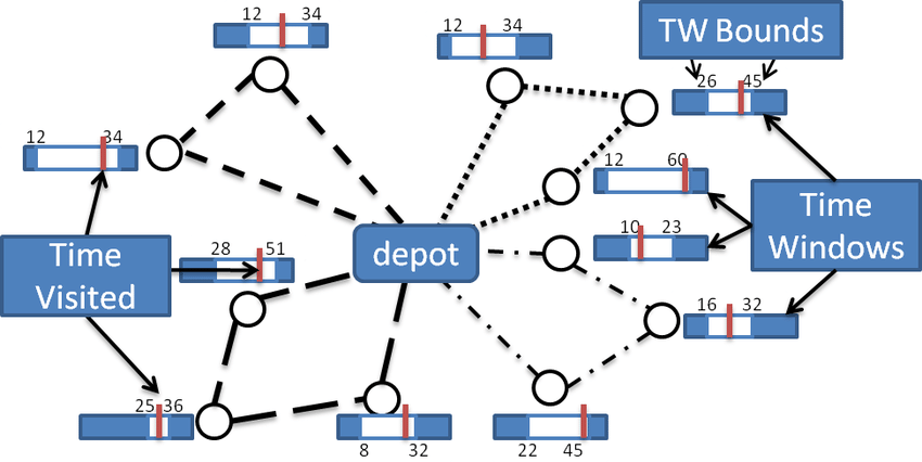 Nhiều vấn đề định tuyến xe liên quan đến việc lên lịch cho các khách hàng chỉ có sẵn trong các khung thời gian cụ thể. Mục tiêu là để giảm thiểu tổng thời gian di chuyển của các phương tiện.Time(0,3)là khung giờ , có nghĩa là phương tiện phải đến đó trong khoảng thời gian từ 2 đến 3 để đúng lịch trình.