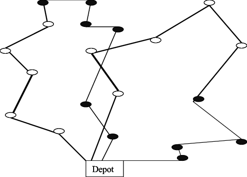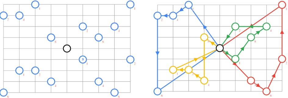 Mỗi chiếc xe nhận/giao hàng tại các địa điểm khác nhau và giao chúng ở những nơi khác. Chỉ định các lộ trình cho các phương tiện để nhận và giao tất cả các mặt hàng, trong khi giảm thiểu chiều dài của lộ trình dài nhất.